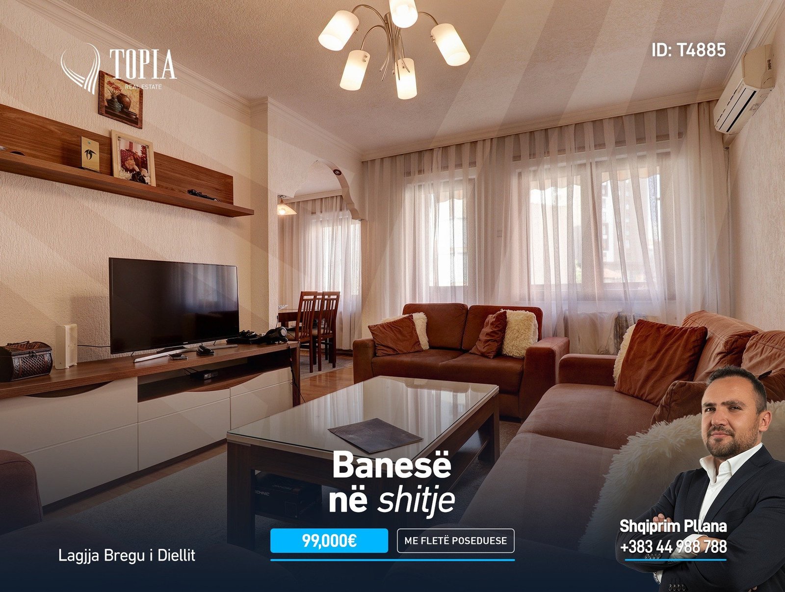 Banesa gjendet në lagjen Bregu i Diellit, më saktësisht te banesat e bardha dhe ka qasje direkte në rrugën kryesore “Gazmend Zajmi”. Lokacioni i banesës është shumë i favorshëm pasi që në afërsi ndodhet shkolla fillore “Iliria”, po ashtu koncepti i lagjes ku ndodhet banesa ka në afërsi shumë shërbimë te tjera të nevojshme si: qendra e mjekësisë familjare, institucionet parashkollore, trafikun urban, parking të jashtëm të mjaftueshëm, hapësira rekreative dhe hapësira të gjelbërta. Banesa është e renovuar dhe e gatshme për banim, orientohet në perëndim, si dhe ka sipërfaqe totale prej 63.25m2 neto në fletë poseduese.